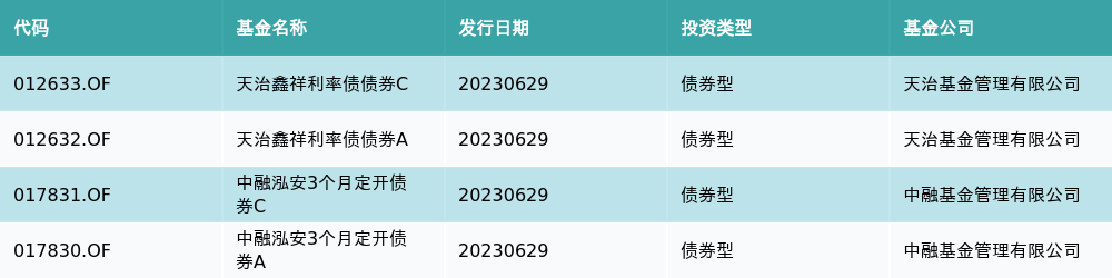 6月29日有4只新基金发行,分别为:天治鑫祥利率债债券C、天治鑫祥利率债债券A、中融泓安3个月定开债券C、中融泓安3个月定开债券A,详情见下表: