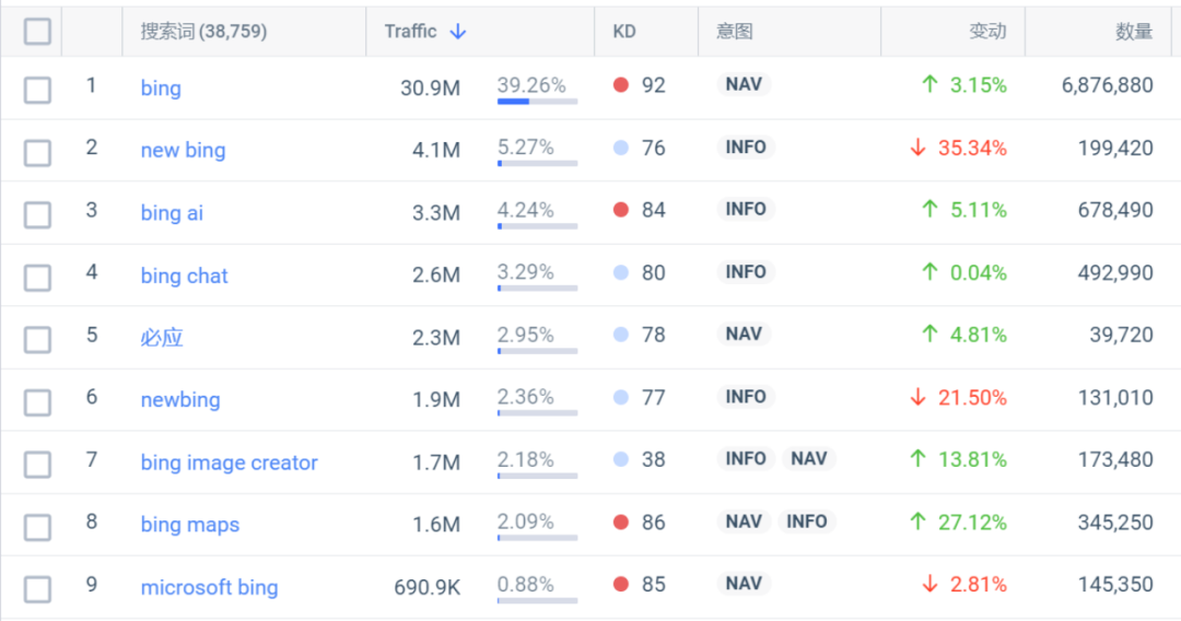 来自SimilarWeb的数据洞察显示,2月份引入GPT-3.5/4模型的Bing,在3-5月份的自然搜索关键词中,用户使用代表大模型版本的New bing等关键词搜索进入的自然流量,合计大幅下滑56.84%。