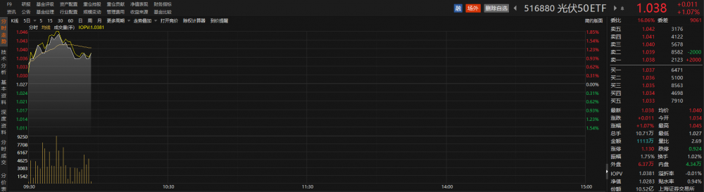 跟踪中证光伏产业指数的光伏50ETF(516880)早盘走高,截至发稿,涨幅为1.07%,成交额超1100万元。值得注意的是,该ETF近期持续反弹,今日盘中创出5月26日以来新高。