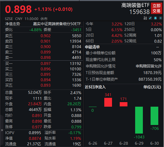ETF方面,截至早盘收盘,高端装备ETF(159638)上涨1.13%,成交额超4600万元,换手率2.43%。