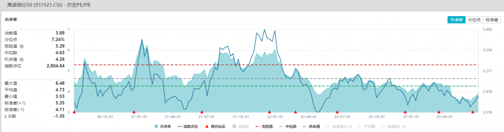 板块估值方面,中证高端装备细分50指数估值处于历史低位,最新市净率PB为3.89倍,3年估值分位点为7.24%。