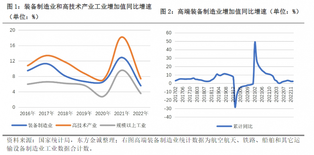 东方金诚报告显示,2023年高端装备制造业将保持较快增长态势,其中航空装备、卫星制造、工业机器人等子行业将实现较快增长,在政策和需求双重驱动下,预计2023年我国高端装备制造业将继续保持较快增长。