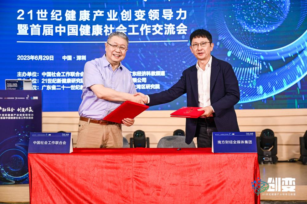 21世纪经济报道见习记者 林昀肖 深圳报道 为深入贯彻实施健康中国战略,在基层切实开展健康中国行动,打造健康友好型社会,6月29日,由中国社会工作联合会、21世纪经济报道、广东经济科教频道联合主办的“产融结合 创变共赢——21世纪健康产业创变领导力暨首届中国健康社会工作交流会”在深圳坪山成功举行。本次活动上,南方财经全媒体集团与中国社会工作联合会共同签署“健康社会工作”战略合作协议,双方旨在强强联手,一起合力开创健康社会工作新局面,推动中国健康社会工作高质量发展。