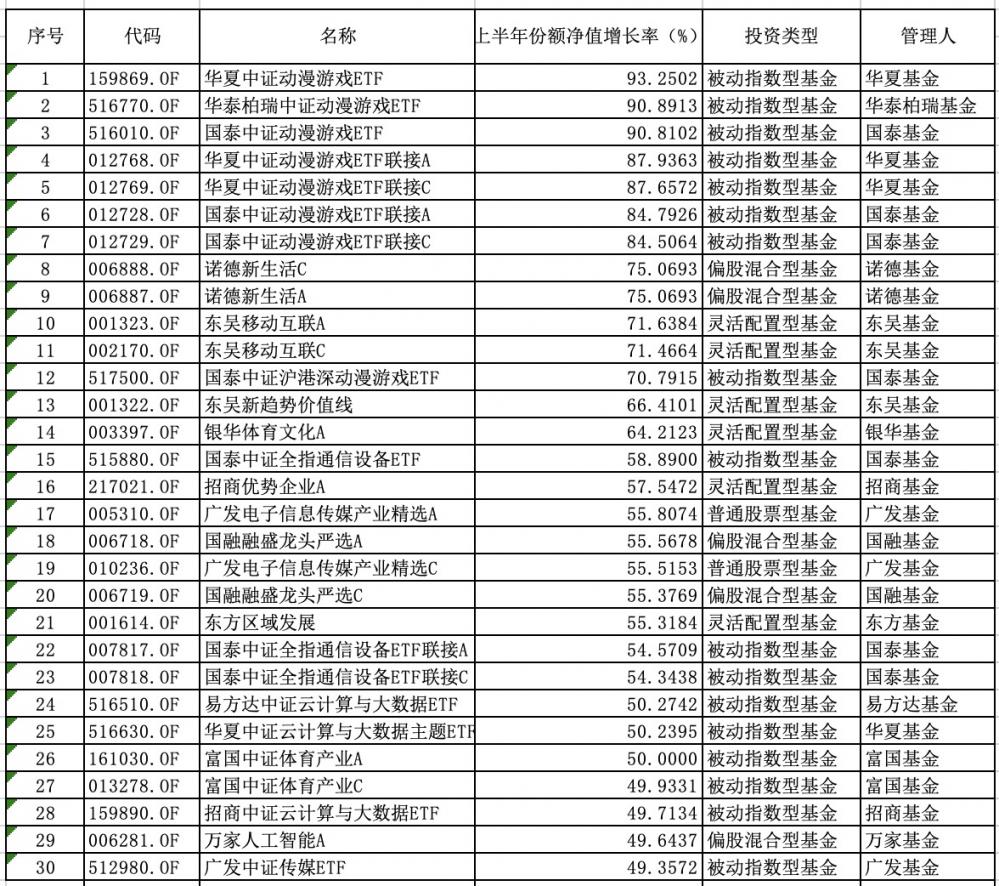 具体来看,上半年共有22只主动权益基金业绩超过40%,包括诺德新生活、东吴移动互联、东吴新趋势价值线、银华体育文化A、招商优势企业A、广发电子信息传媒产业精选A、国融融盛龙头严选A、东方区域发展等。这些上半年表现较好的基金投资方向主要聚焦在AI、数字经济、TMT、“中特估”等板块。