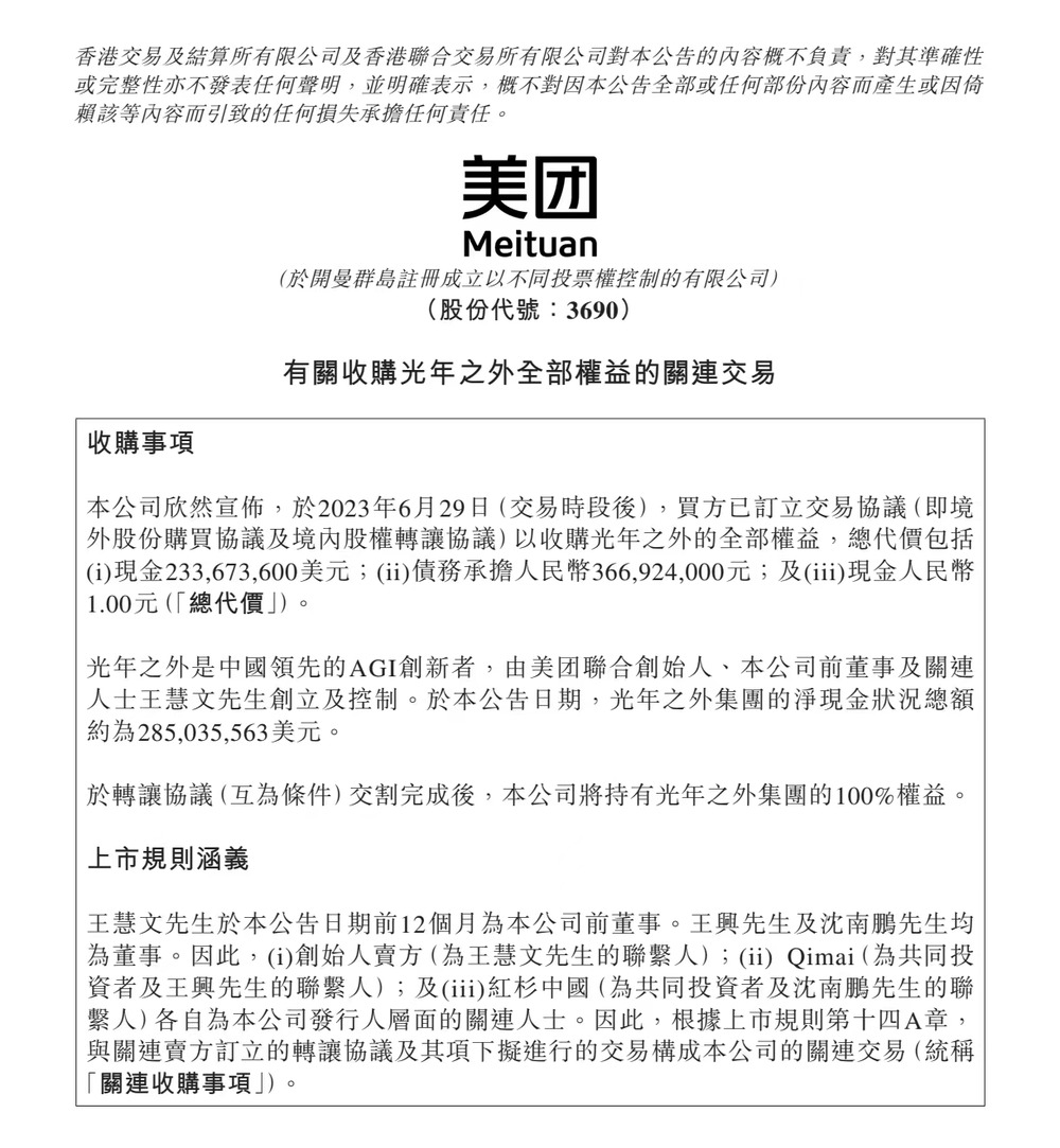 昨天下午,美团在港交所网站宣布,已订立交易协议收购光年之外的全部权益,总代价包括现金233,673,600(2.3亿)美元;债务承担人民币366,924,000(3.7亿)元;及现金人民币1.00元。