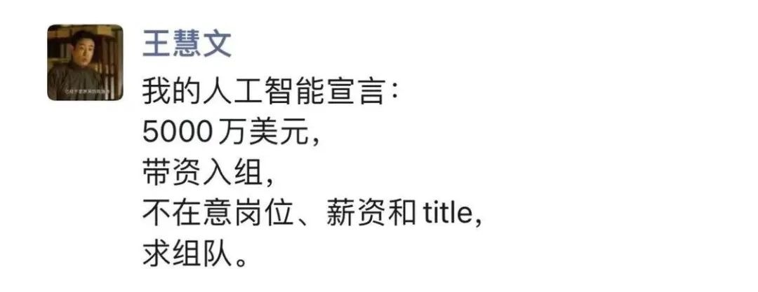 今年 2 月,从美团退休两年多的王慧文发朋友圈称要打造「中国的 OpenAI」,出资 5000 万美元成立 AI 公司光年之外,并发布「英雄帖」,招募 AI 人才。一时之间,一呼百应。智源研究院副院长刘江、“搜狗输入法之父”马占凯先后加入,美团创始人王兴、快手创始人宿华也均以个人身份投资光年之外,腾讯也被曝在投资方之列。
