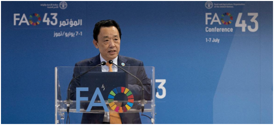 (来自中国的屈冬玉在粮农组织大会第43届会议上获得连任,图片来源:粮农组织 )