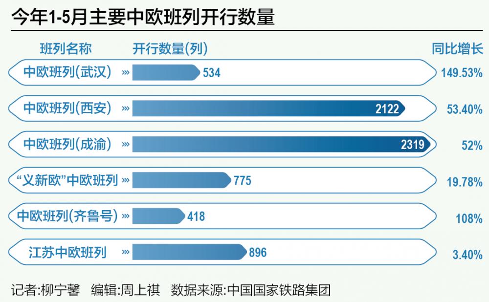 中国国家铁路集团有限公司数据显示,今年前5个月,中欧班列累计开行7126列,同比增长16%;中欧班列累计运送货物77.4万标准箱,同比增长31%。根据南方财经全媒体记者不完全统计,今年1-5月,中欧班列(武汉)、中欧班列(齐鲁号)、中欧班列(西安)、中欧班列(成渝)、“义新欧”中欧班列、江苏中欧班列开行数量分别同比增长149.53%、108%、53.4%、52%、19.78%、3.4%。
