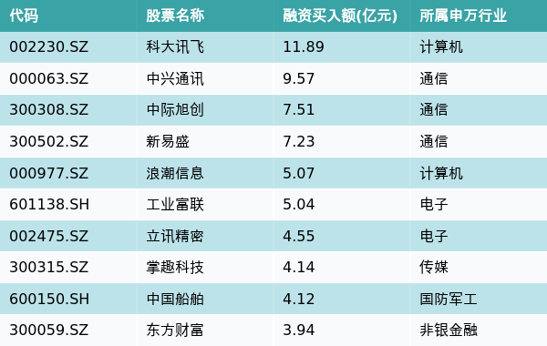 7月3日,两市共有3193只个股有融资资金买入,其中科大讯飞、中兴通讯、中际旭创排名前三,买入金额分别11.89亿元、9.57亿元、7.51亿元。融资买入额前10个股详情见下表: