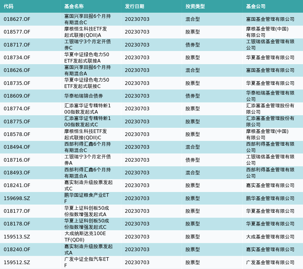 7月3日有20只新基金发行,分别为:富国兴享回报6个月持有期混合C、摩根恒生科技ETF发起式联接(QDII)A、工银瑞宁3个月定开债券C、华夏中证绿色电力50ETF发起式联接A、富国兴享回报6个月持有期混合A、华夏中证绿色电力50ETF发起式联接C、华泰柏瑞锦合债券、汇添富华证专精特新100指数发起式A、汇添富华证专精特新100指数发起式C、摩根恒生科技ETF发起式联接(QDII)C、西部利得汇鑫6个月持有期混合C、工银瑞宁3个月定开债券A、西部利得汇鑫6个月持有期混合A、嘉实制造升级股票发起式C、鹏华国证粮食产业ETF、华夏上证科创板50成份指数增强发起式A、华夏上证科创板50成份指数增强发起式C、大成纳斯达克100ETF(QDII)、嘉实制造升级股票发起式A、广发中证全指汽车ETF,详情见下表: