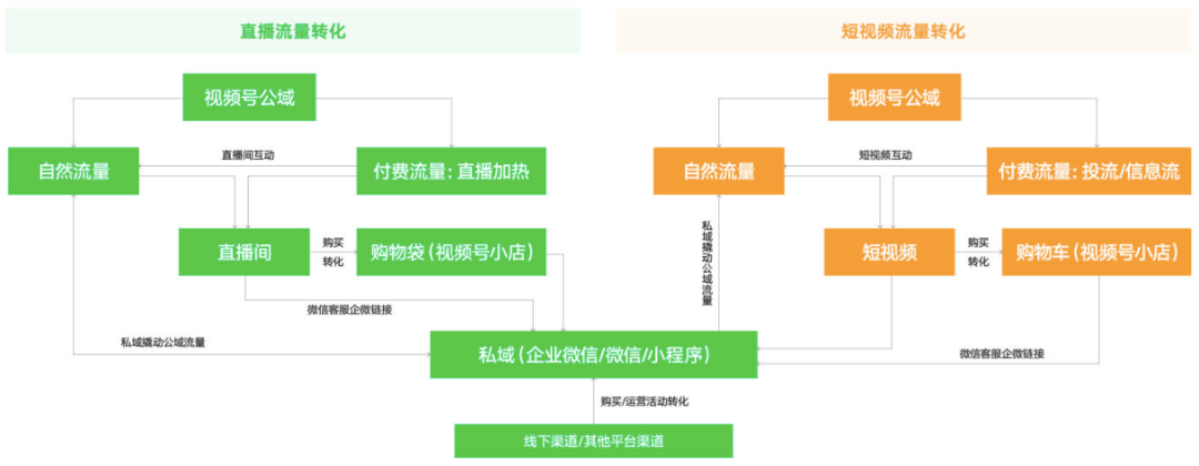 目前微信已将视频号与公众号、小程序、企业微信、朋友圈、搜一搜等其他公私域触点打通,在公众号、小程序、企业微信等私域触点上都能链接到视频号,同时,视频号直播时也能引导用户关注企业微信,沉淀到私域。