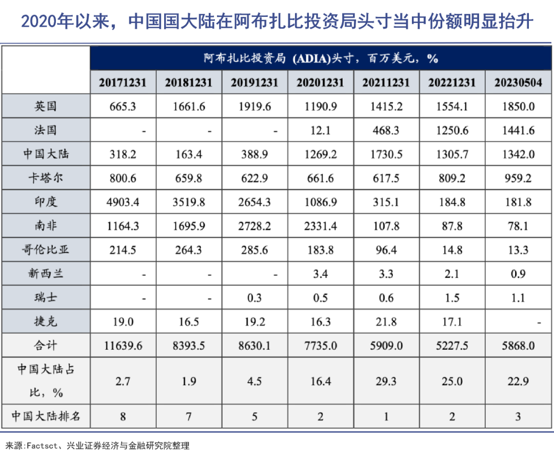 兴业证券数据显示,大陆资产在阿布扎比投资局的寸头占比,从2017年末的2.7%,飙升到了2023年一季度的22.9%,排名跃升至第3位。东方雨虹、格力电器、大全能源的股东中都有阿布扎比的身影。
