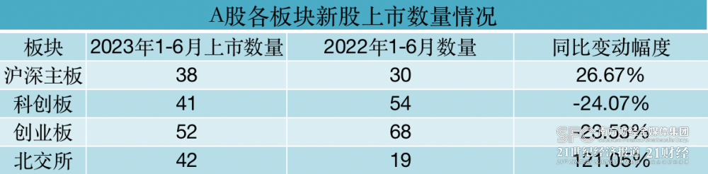 分板块来看,科创板是上半年新股上市数量降幅最大者。1-6月,科创板新上市公司共41家,较去年同期减少13家,较去年下半年减少29家。
