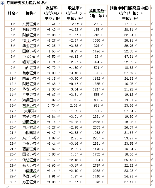 排在榜单后10名的分别是东莞证券、万联证券、财信证券、德邦证券、华金证券、国联证券、中金公司、银河证券、山西证券、首创证券。记者留意到,倒数第一的东莞证券今年前6个月多次出现在月度榜倒数靠前的位置,而倒数第二的万联证券则在5月、6月的月度榜单中连续拿了两个倒数第一。