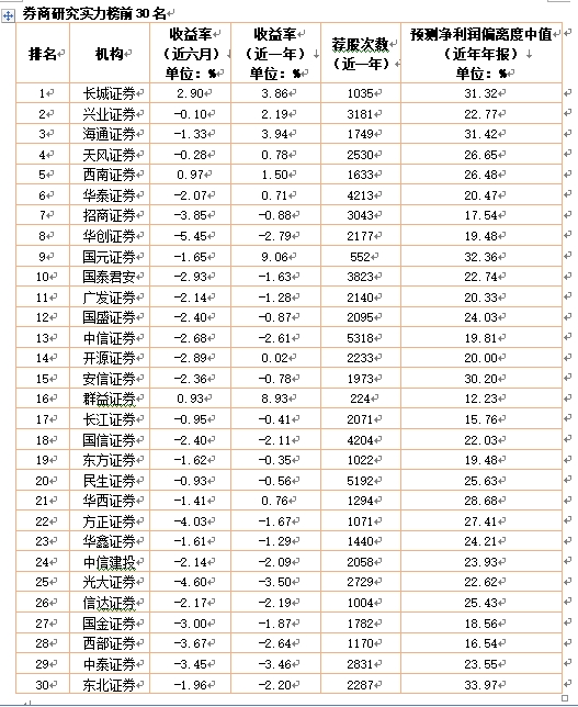 上半年券商研究实力榜前三名为长城证券、 兴业证券和海通证券