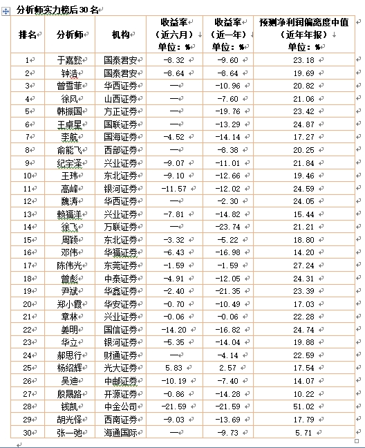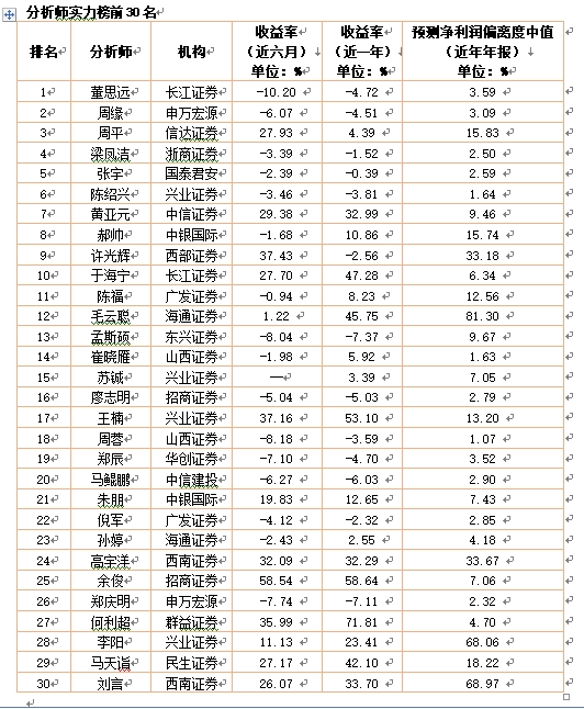 第二名至第十名依次为申万宏源周缘、信达证券周平、浙商证券梁凤洁、国泰君安张宇、兴业证券陈绍兴、中信证券黄亚元、中银国际郝帅、西部证券许光辉以及长江证券于海宁。后10名分别是国泰君安于嘉懿、国泰君安钟浩、华西证券曾雪菲、山西证券徐风、方正证券韩振国、国联证券王卓星、国海证券李航、西部证券俞能飞、兴业证券纪宇泽、东北证券王玮。