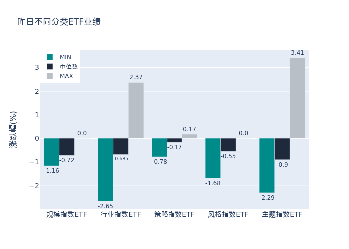 昨日股票型ETF收益率中位数为-0.73%。其中按照不同分类,规模指数中新经济收益率最高,为0.0%;行业指数中万家中证工业有色金属主题ETF收益率最高,为2.37%;策略指数中华泰柏瑞上证红利ETF收益率最高,为0.17%;风格指数中汇添富中证800价值ETF收益率最高,为0.0%;主题指数中嘉实中证稀土产业ETF收益率最高,为3.41%。