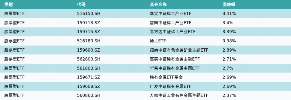昨日股票型ETF涨幅最高的3支ETF及其收益率分别为:嘉实中证稀土产业ETF(3.41%)、富国中证稀土产业ETF(3.4%)、易方达中证稀土产业ETF(3.39%)。涨幅前10详情见下表: