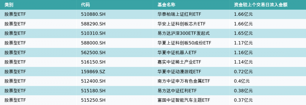 昨日股票型ETF资金流入最多的3支ETF及其流入金额分别为:华泰柏瑞上证红利ETF(流入1.66亿元)、华安上证科创板芯片ETF(流入1.66亿元)、易方达沪深300ETF发起式(流入1.65亿元)。资金流入前10详情见下表: