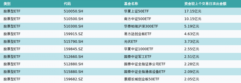 昨日股票型ETF资金流出最多的3支ETF及其流入金额分别为:华夏上证50ETF(流出17.15亿元)、南方中证500ETF(流出10.15亿元)、华泰柏瑞沪深300ETF(流出5.19亿元)。资金流出前10详情见下表:
