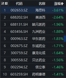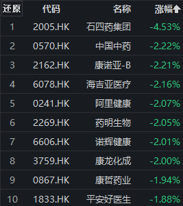 港股方面,医疗医药股同样多数下跌。相关指数中,中证港股通医药卫生综合指数 (930965) 早盘走低。截至发稿,成分股中,石四药集团跌超4%,中国中药、康诺亚-B、海吉亚医疗、阿里健康、药明生物等跌逾2%。
