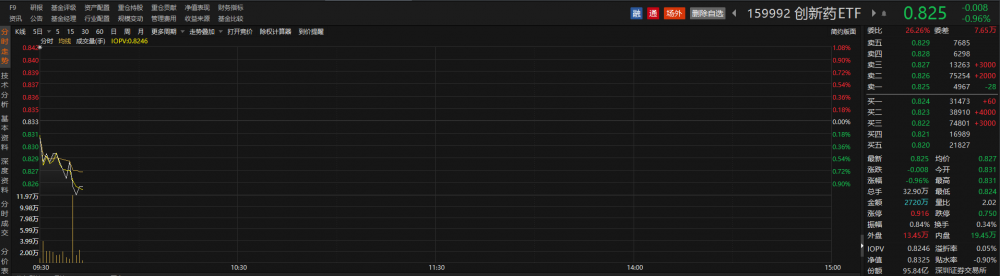 跟踪该指数的ETF中规模最大的创新药ETF(159992)早盘下跌,截至发稿,跌幅为0.96%,溢折率为0.05%。