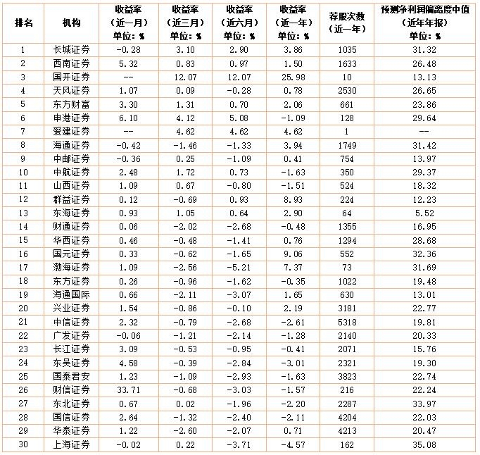 投资快报投研通数据显示,排名第一的长城证券最近一年荐股1035次。近一个月、三个月、六个月和近一年收益率分别为0.28%、3.10%、2.9%和3.86%。近年年报预测净利润偏离度中值为31.32%。据长城证券介绍,作为国内较早成立的综合类证券公司之一,经过二十余年的发展壮大,长城证券已经形成了多功能协调发展的金融业务体系。控股宝城期货、长城证券投资等多家子公司,同时是长城基金、景顺长城基金两家公募基金的主要股东。