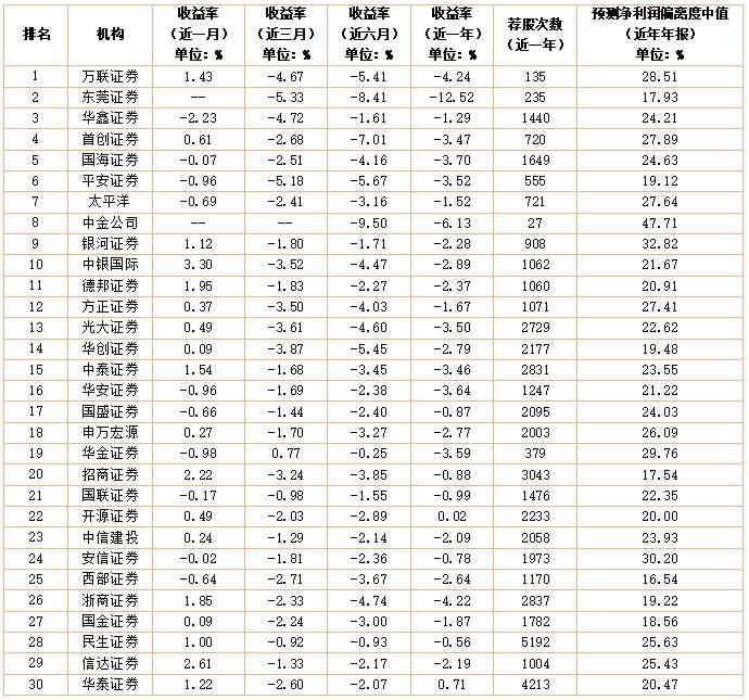 排在榜单后10名的分别是万联证券、东莞证券、华鑫证券、首创证券、国海证券、平安证券、太平洋证券、中金公司、银河证券、中银国际。值得注意的是万联证券已连续两月倒数第一,而位于券商行业头部公司之列的银河证券连续多次出现在排名倒数的名单中让人感到“意外”。