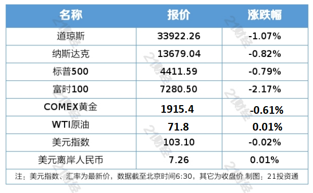 1、美股三大指数集体收跌,道指跌1.07%,纳指跌0.82%,标普500指数跌0.79%。大型科技股多数下跌,亚马逊、奈飞、谷歌跌超1%,脸书小幅下跌;苹果、微软小幅上涨。银行股全线走低,花旗跌超3%,高盛、摩根士丹利、美国银行跌超2%,富国银行跌超1%,摩根大通小幅下跌。