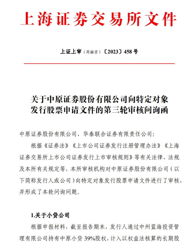 上交所在第三轮问询函中提出两个问题,一个是中原证券旗下小贷公司股权处理进度和后续安排,另一个则是拷问融资的必要性。