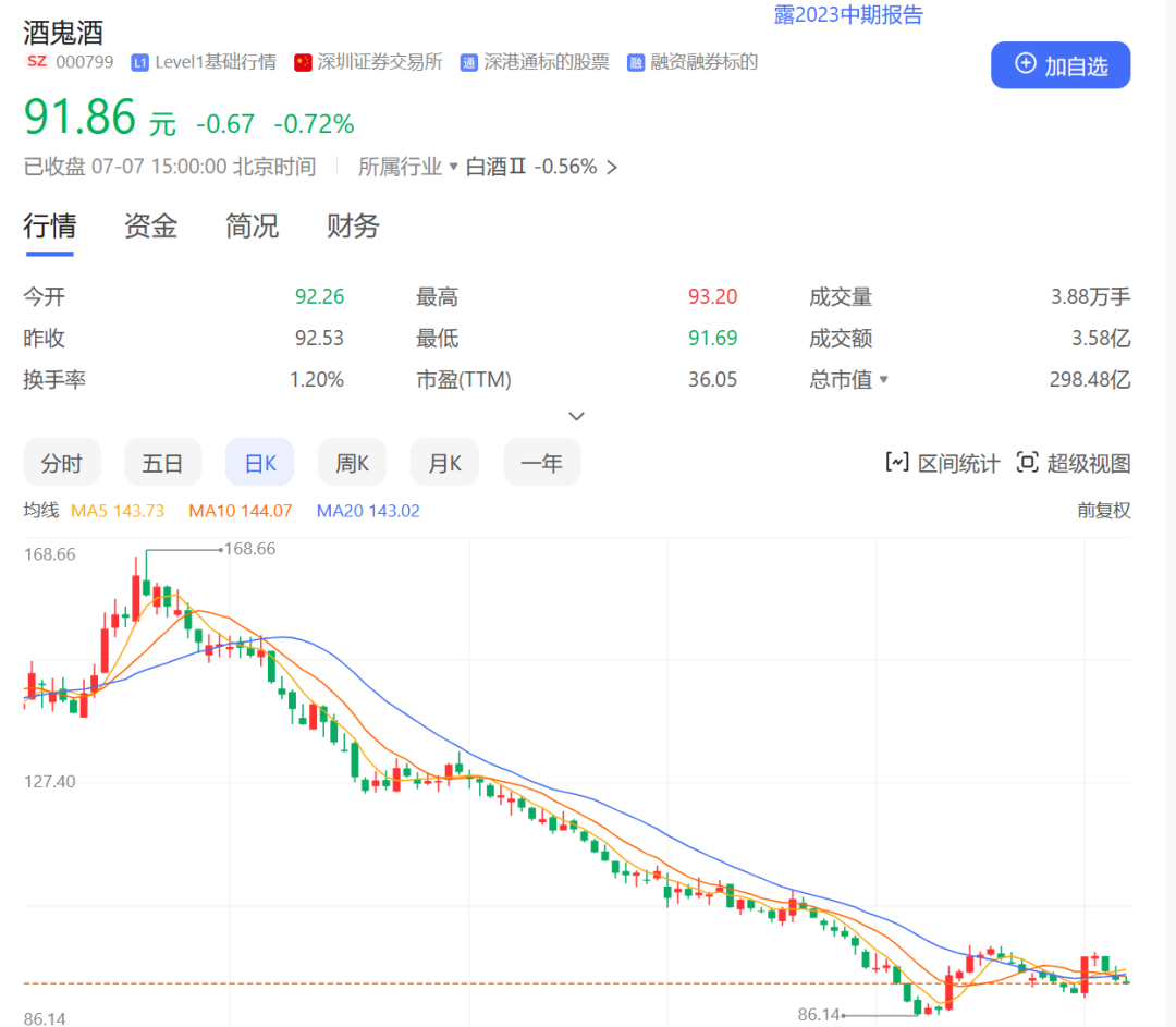 其中,酒鬼酒由最高168.66元每股,跌至最低86.62元每股,股价跌幅近50%;山西汾酒由最高的310.66元每股,跌至最低184.55元每股,股价跌幅超40%。
