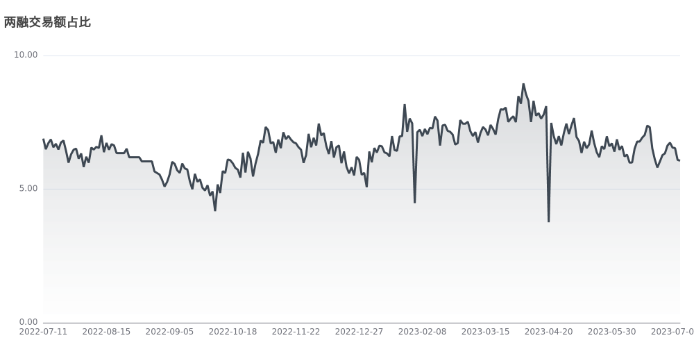 今日该指标值为6.06%,目前该指标处于近一年较低区间,说明投资者认为A股市场趋于触底反弹。反映场内投资者借钱炒股的杠杆水平,该指标越高说明杠杆水平越高,即投资者认为当前市场较强,反之则说明投资者认为市场相对较弱,因而与上证指数存在较强的正相关性。