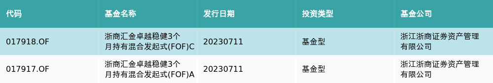 7月11日有2只新基金发行,分别为:浙商汇金卓越稳健3个月持有混合发起式(FOF)C、浙商汇金卓越稳健3个月持有混合发起式(FOF)A,详情见下表: