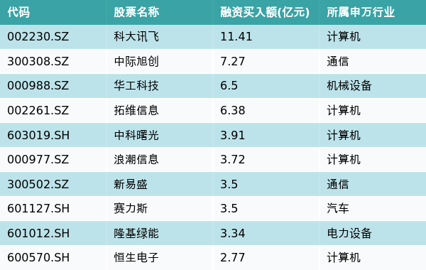 7月11日,两市共有3224只个股有融资资金买入,其中科大讯飞、中际旭创、华工科技排名前三,买入金额分别11.41亿元、7.27亿元、6.5亿元。融资买入额前10个股详情见下表: