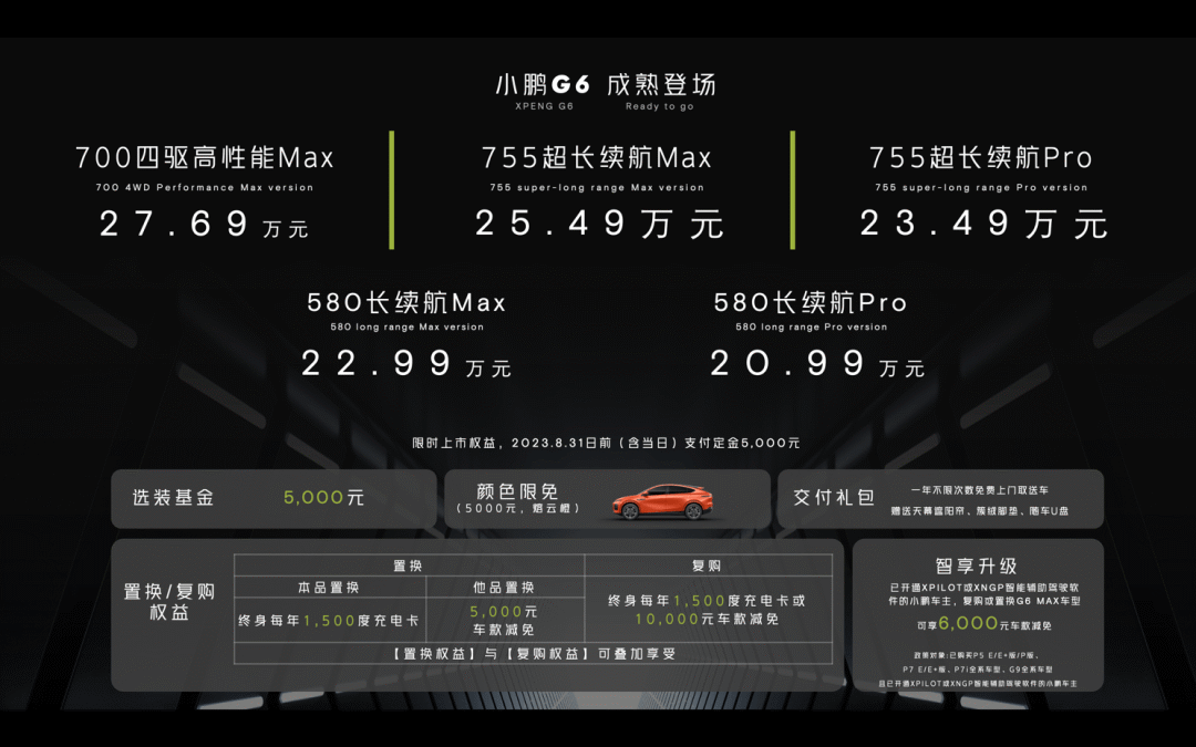 何小鹏亟需一款新车扭转颓势,G6也明显吸取了教训,分为580km、700km、755 km三个续航版本,并以是否搭载智能驾驶XNGP系统分为Max和Pro版本。