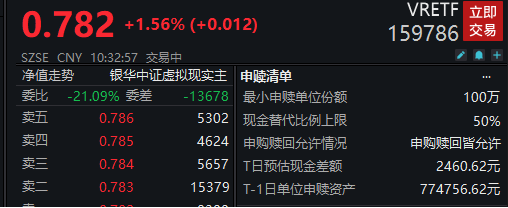作为全市场首只VRETF,跟踪中证虚拟现实主题指数的VRETF(159786)早盘持续上涨,截至发稿,涨幅为1.56%。