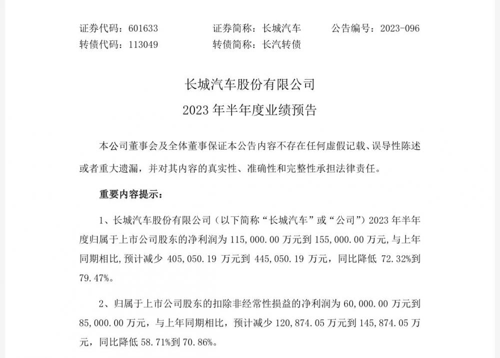 7月14日,长城汽车股份有限公司(601633.SH)发布了2023年上半年财报预报。