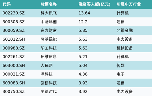 7月13日,两市共有3229只个股有融资资金买入,其中科大讯飞、中际旭创、东方财富排名前三,买入金额分别13.64亿元、12.2亿元、5.85亿元。融资买入额前10个股详情见下表: