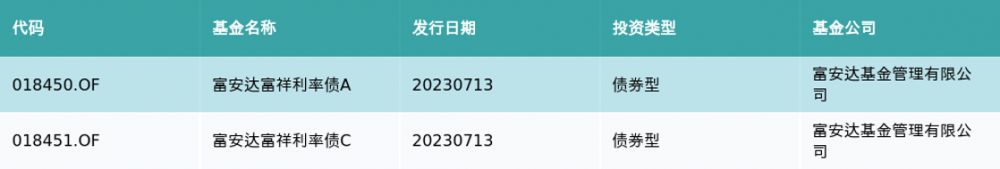7月13日有2只新基金发行,分别为:富安达富祥利率债A、富安达富祥利率债C,详情见下表:
