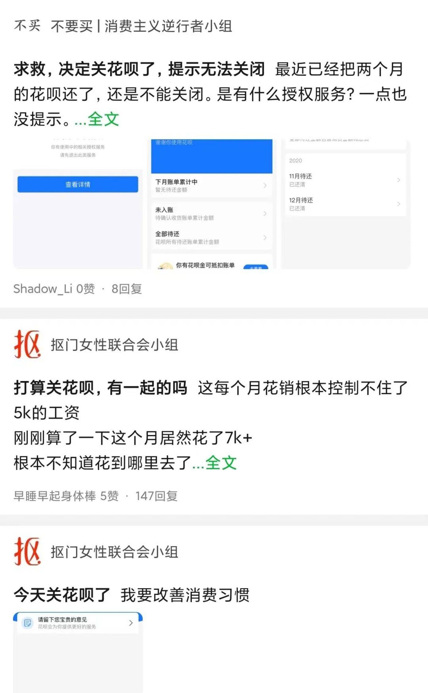 “痛心疾首”的不止安雅,在豆瓣、小红书上,不少年轻人分享自己关闭了花呗、白条、微粒贷、信用卡,或计划还清负债后就“关门大吉”,他们称之为“上岸”。