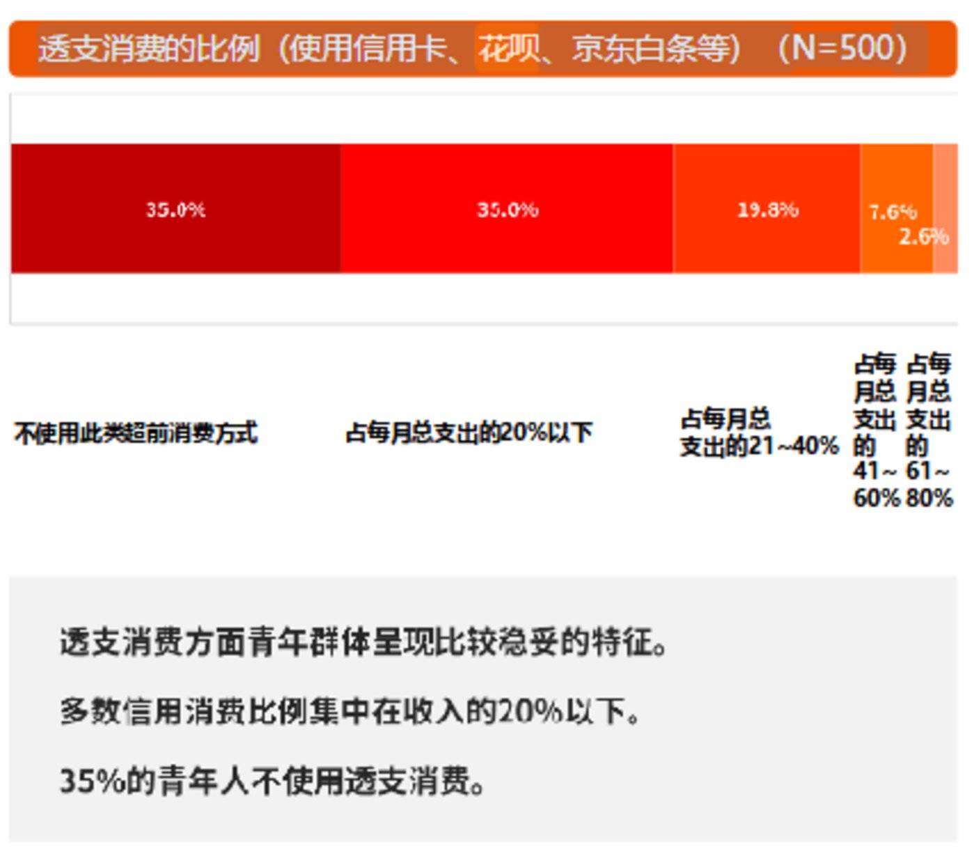 另有时趣研究院在今年5月发布的《时趣中国青年生活消费观调研及营销洞察报告》显示,在调研样本中,只有35%的青年人不使用透支消费,多数信用消费比例集中在收入的20%以下。
