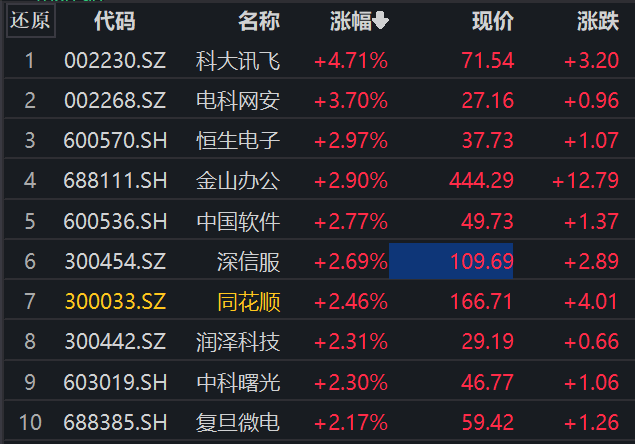 涨幅方面,科大讯飞涨近5%,获主力资金抢筹超5亿元,电科网安涨超3%,恒生电子、金山办公、中国软件、深信服、同花顺、润泽科技、中科曙光等涨超2%。