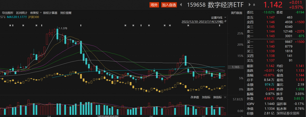 跟踪数字经济(931582)的数字经济ETF(159658)今日盘中快速拉升,截至10点整,该ETF涨0.97%,盘中成交额接近1000万元,换手率3.03%,交投活跃。