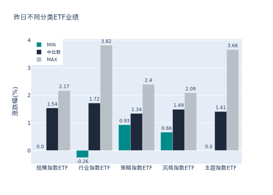 昨日股票型ETF收益率中位数为1.48%。其中按照不同分类,规模指数中嘉实富时中国A50ETF收益率最高,为2.17%;行业指数中香港医药收益率最高,为3.82%;策略指数中南方富时中国国企开放共赢ETF收益率最高,为2.4%;风格指数中华夏创成长ETF收益率最高,为2.09%;主题指数中酒ETF收益率最高,为3.66%。