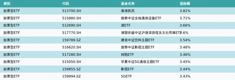 昨日股票型ETF涨幅最高的3支ETF及其收益率分别为:香港医药(3.82%)、国泰中证全指通信设备ETF(3.71%)、酒ETF(3.66%)。涨幅前10详情见下表: