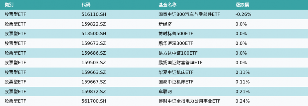 昨日股票型ETF跌幅最大的3支ETF及其收益率分别为:国泰中证800汽车与零部件ETF(-0.26%)、新经济(0.0%)、博时标普500ETF(0.0%)。跌幅前10详情见下表: