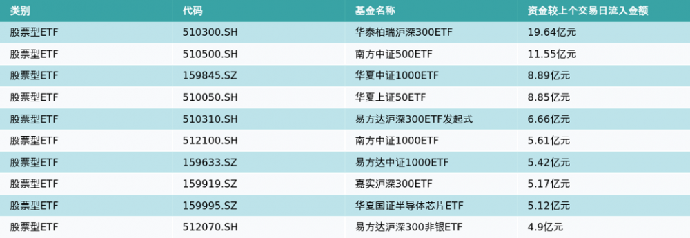 昨日股票型ETF资金流入最多的3支ETF及其流入金额分别为:华泰柏瑞沪深300ETF(流入19.64亿元)、南方中证500ETF(流入11.55亿元)、华夏中证1000ETF(流入8.89亿元)。资金流入前10详情见下表: