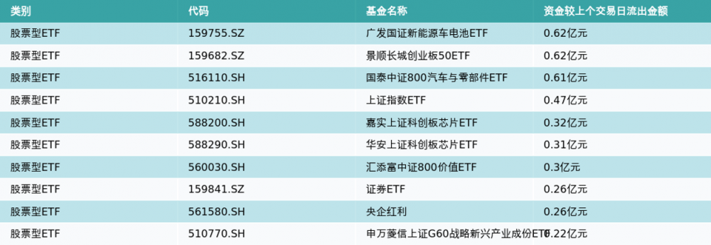 昨日股票型ETF资金流出最多的3支ETF及其流入金额分别为:广发国证新能源车电池ETF(流出0.62亿元)、景顺长城创业板50ETF(流出0.62亿元)、国泰中证800汽车与零部件ETF(流出0.61亿元)。资金流出前10详情见下表: