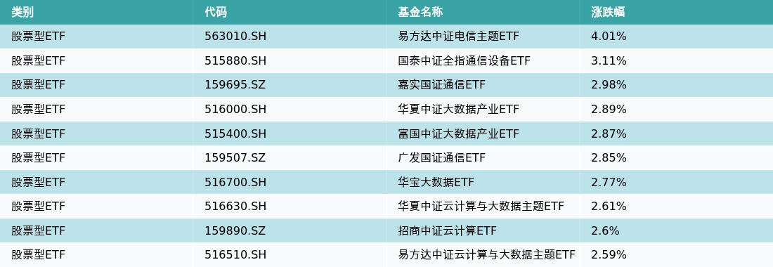 7月14日,股票型ETF涨幅最高的3支ETF及其收益率分别为:易方达中证电信主题ETF(4.01%)、国泰中证全指通信设备ETF(3.11%)、嘉实国证通信ETF(2.98%)。涨幅前10详情见下表:
