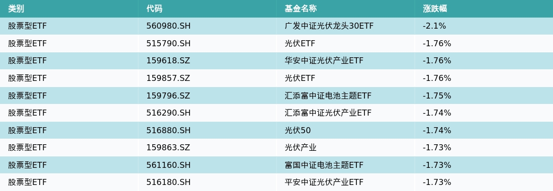 7月14日,股票型ETF跌幅最大的3支ETF及其收益率分别为:广发中证光伏龙头30ETF(-2.1%)、光伏ETF(-1.76%)、华安中证光伏产业ETF(-1.76%)。跌幅前10详情见下表: